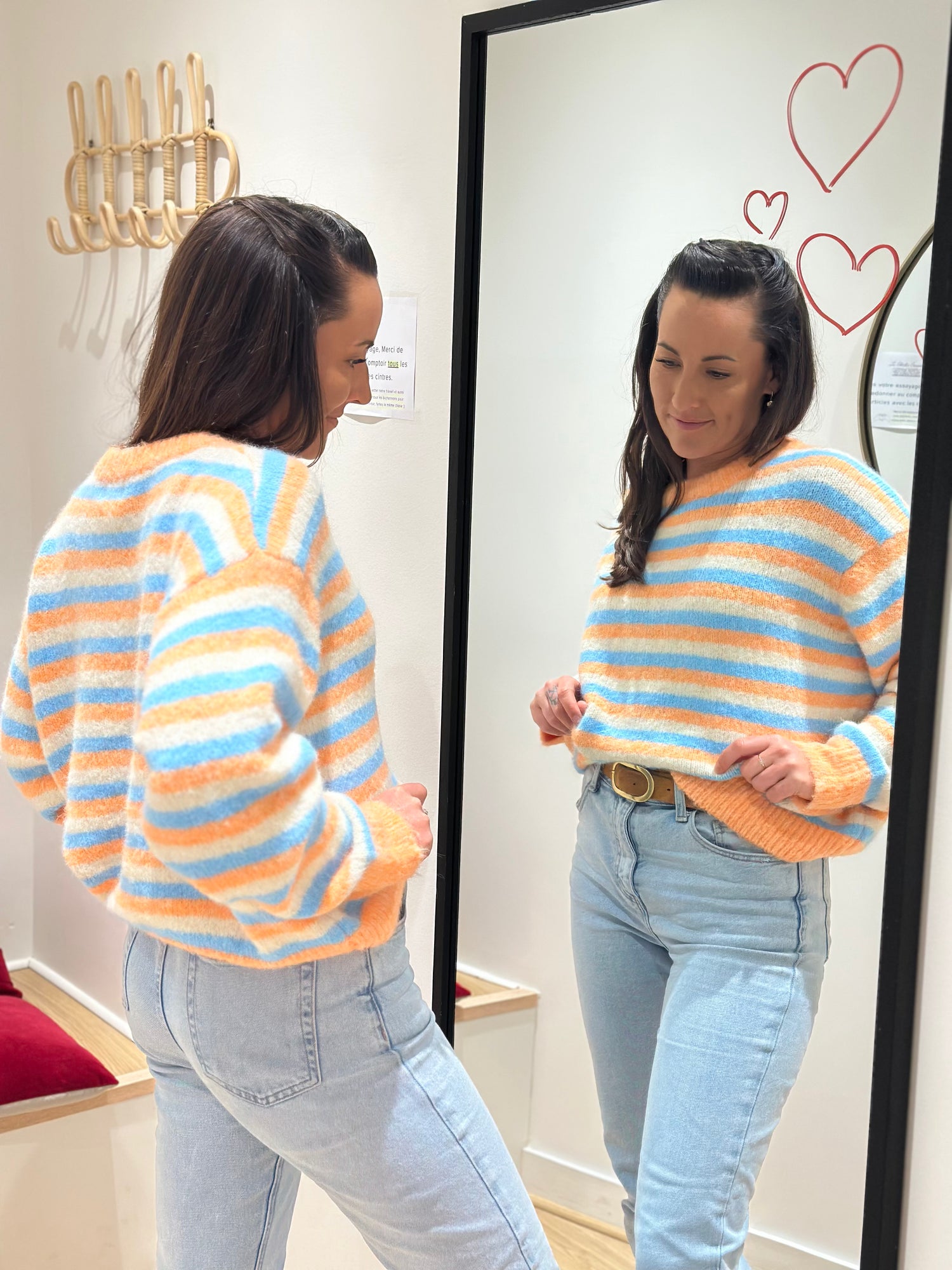 Pull rayé orange bleu écru