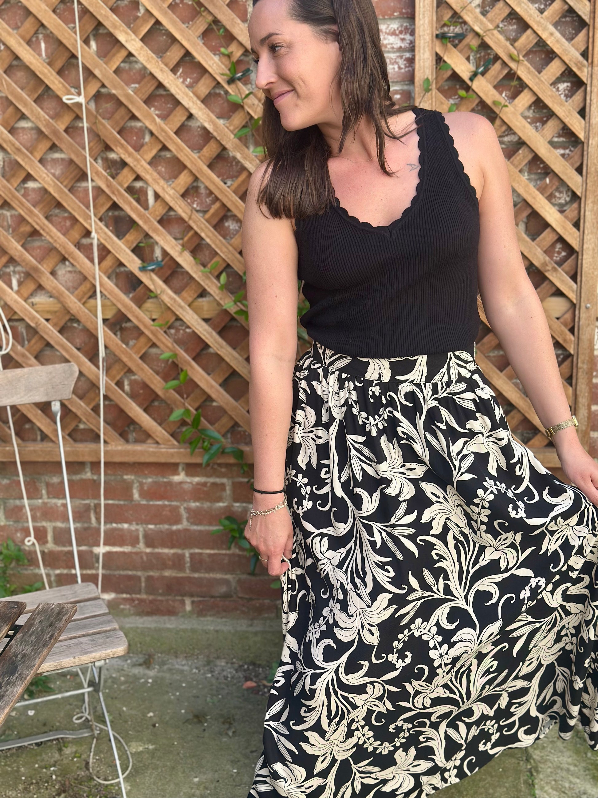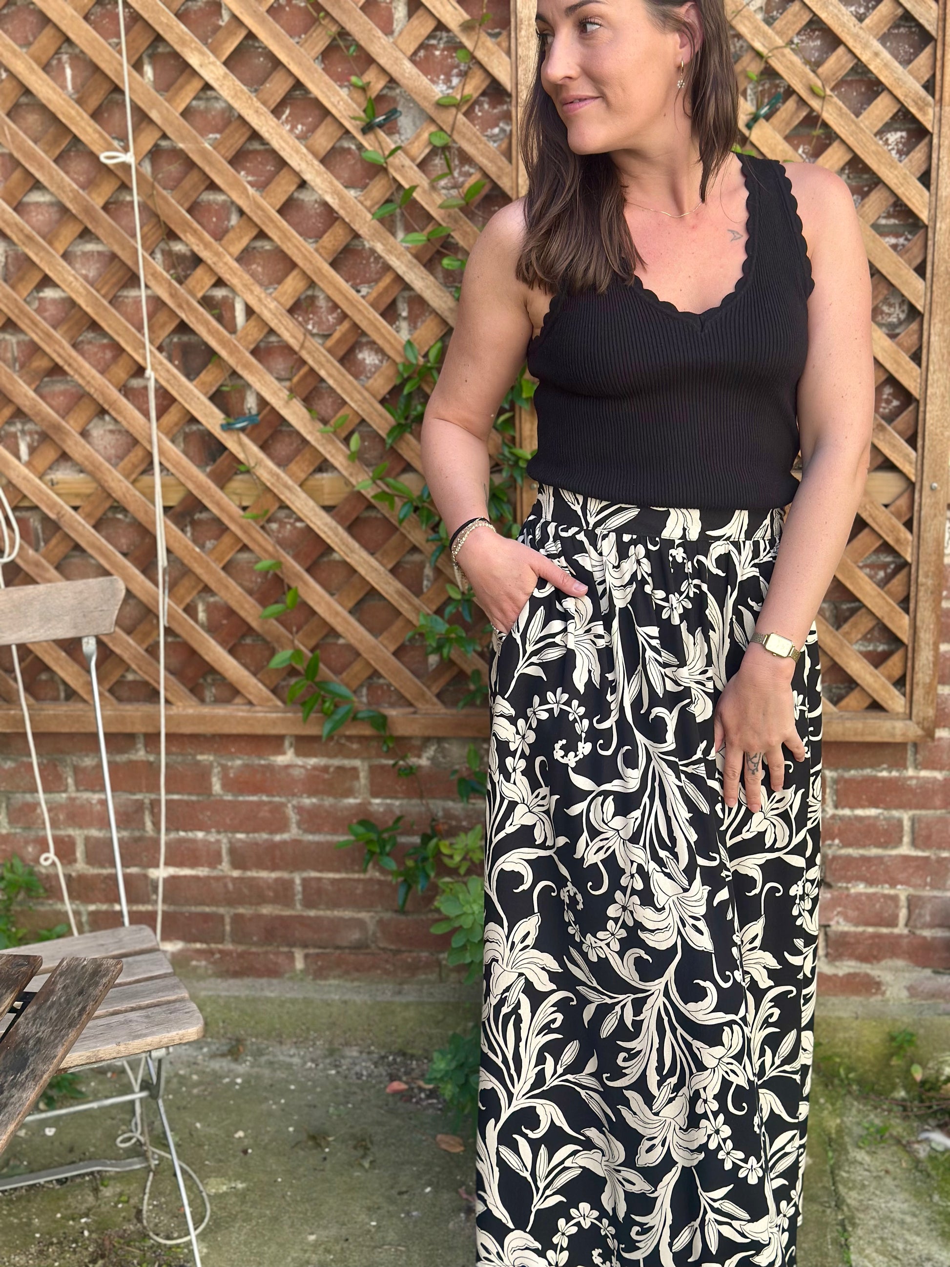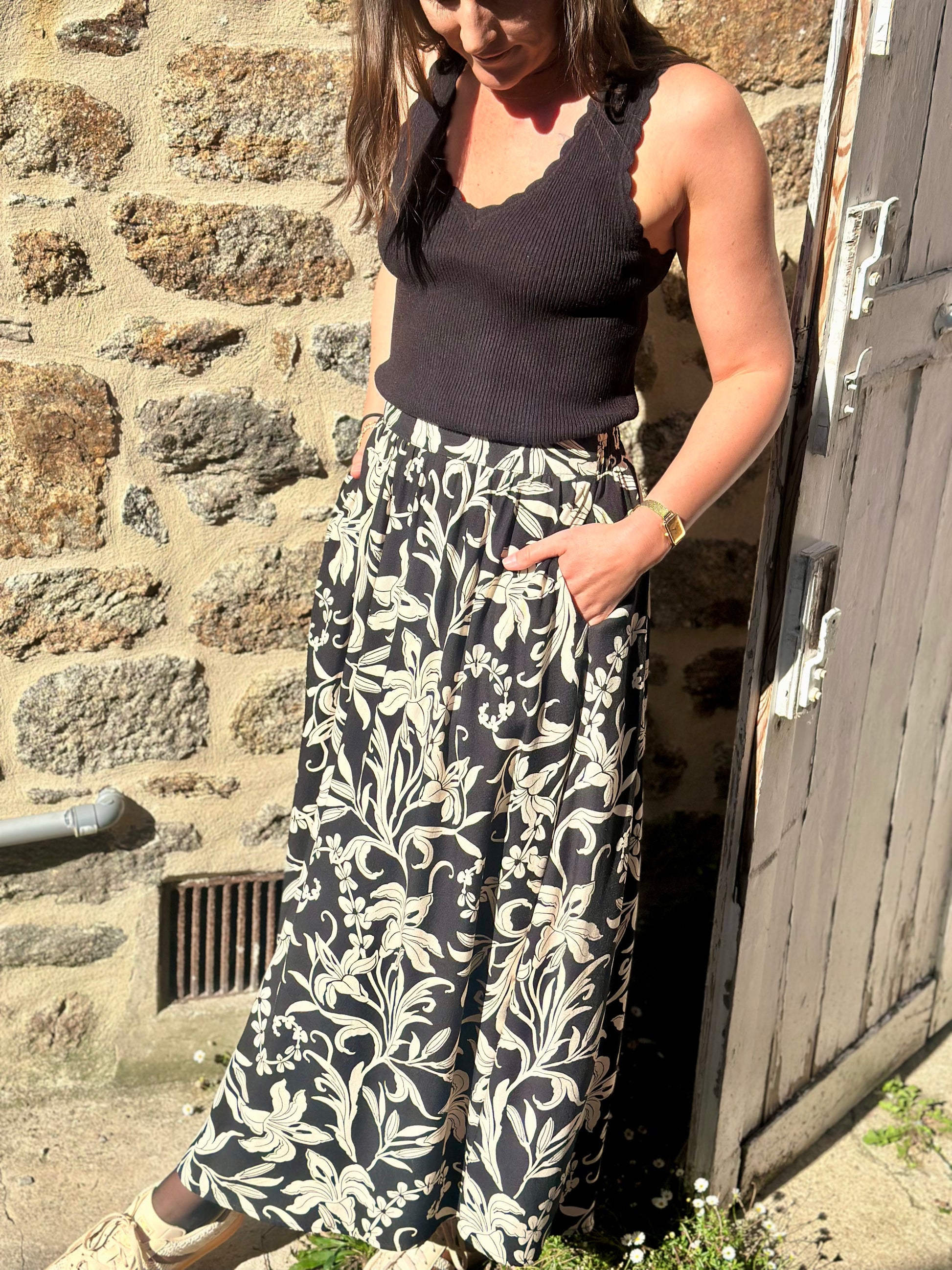 Jupe longue noir feuillage